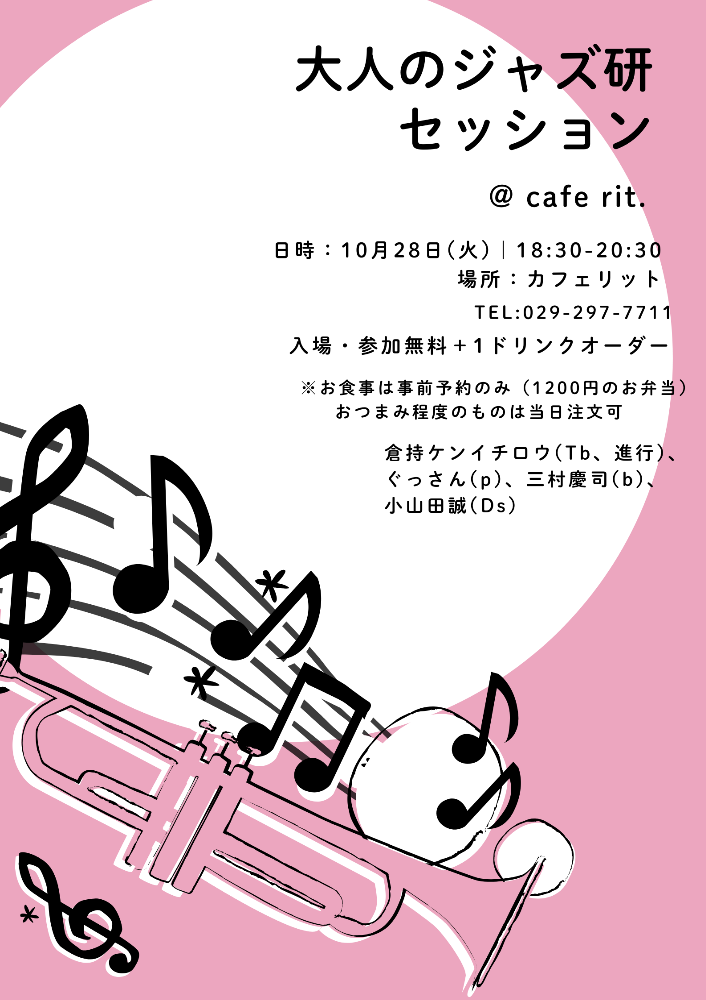 10月28日(火)に大人のジャズ研セッションを開催します。ヴォーカル、楽器での参加希望の方のご予約をお待ちしております!演奏に参加されない方も気軽にご来店ください。食事はご予約のみのご提供になります。