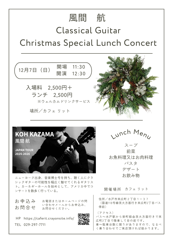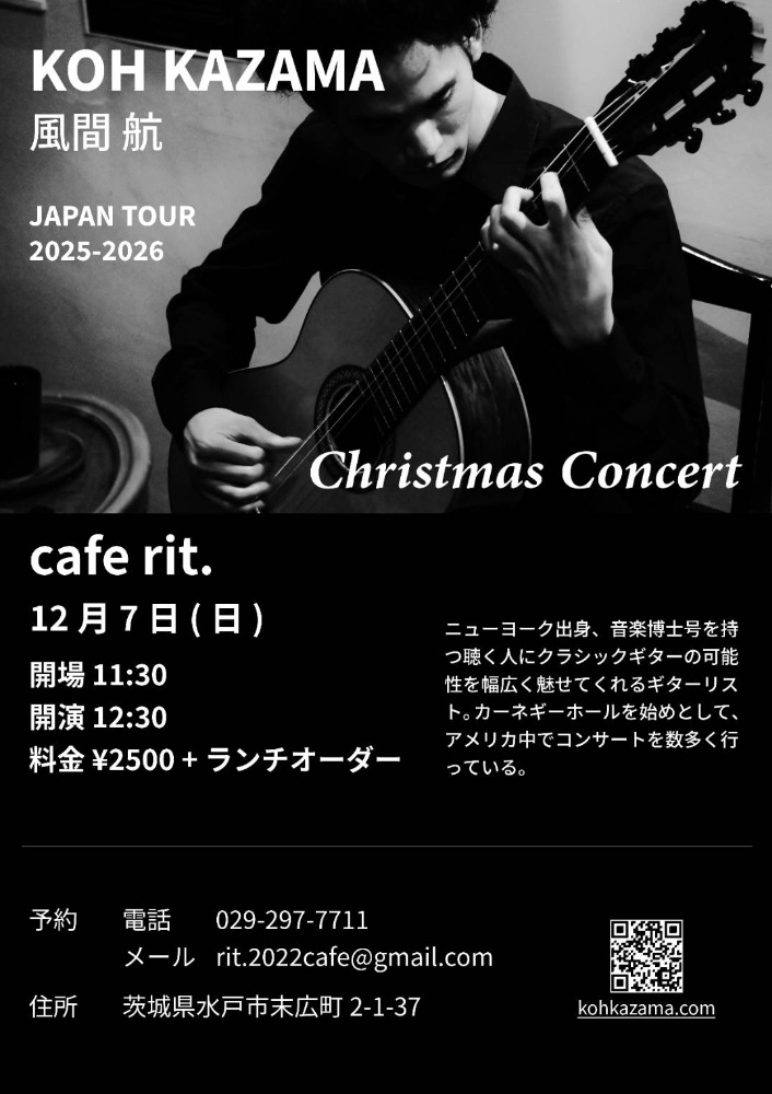 12月7日(日)昼に、ニューヨーク出身のクラシックギター奏者の風間 航さんによるクリスマスコンサートを開催します!カーネギーホールでコンサートを行うなど、米国でも活躍されている素晴らしい奏者さんです。演奏をご覧になりたい方は、こちらをクリックください。