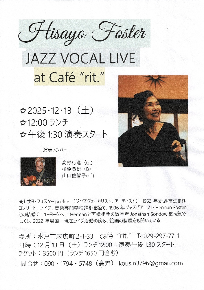 12月13日(土)昼に、ヒサヨ・フォスターさんのジャズヴォーカルライブが開催されます。問い合わせ先など、詳細は、チラシをご覧ください。