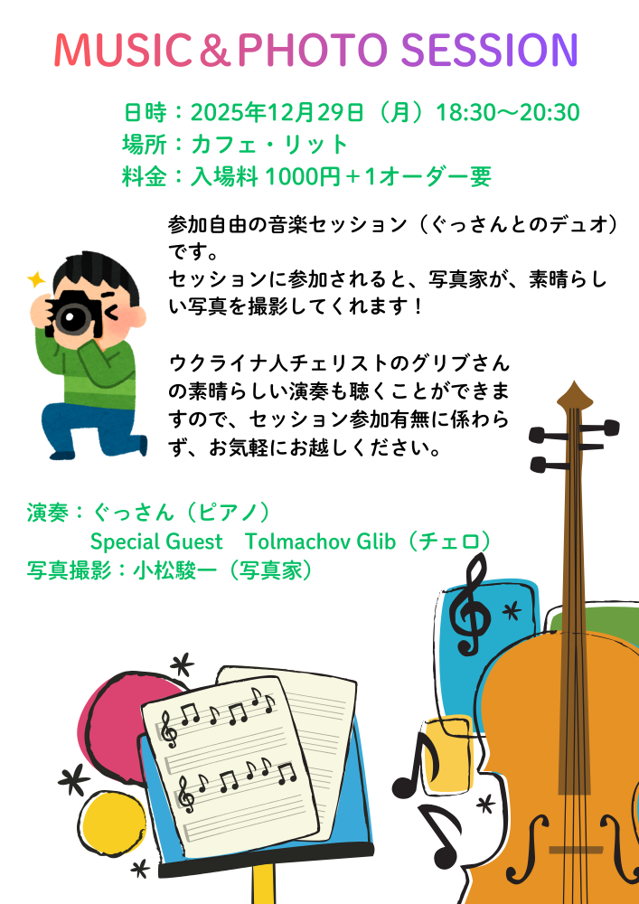 12月29日(月)夜に、MUSIC & PHOTO SESSIONを開催します。セッションに参加すると、写真家が素晴らしい写真を撮影してくれるという、嬉しいイベントです!スペシャルゲストとして、ウクライナ人チェリストのグリブさんの素晴らしい演奏も聴くことができますので、セッション参加有無に係わらず、お気軽にお越しください!